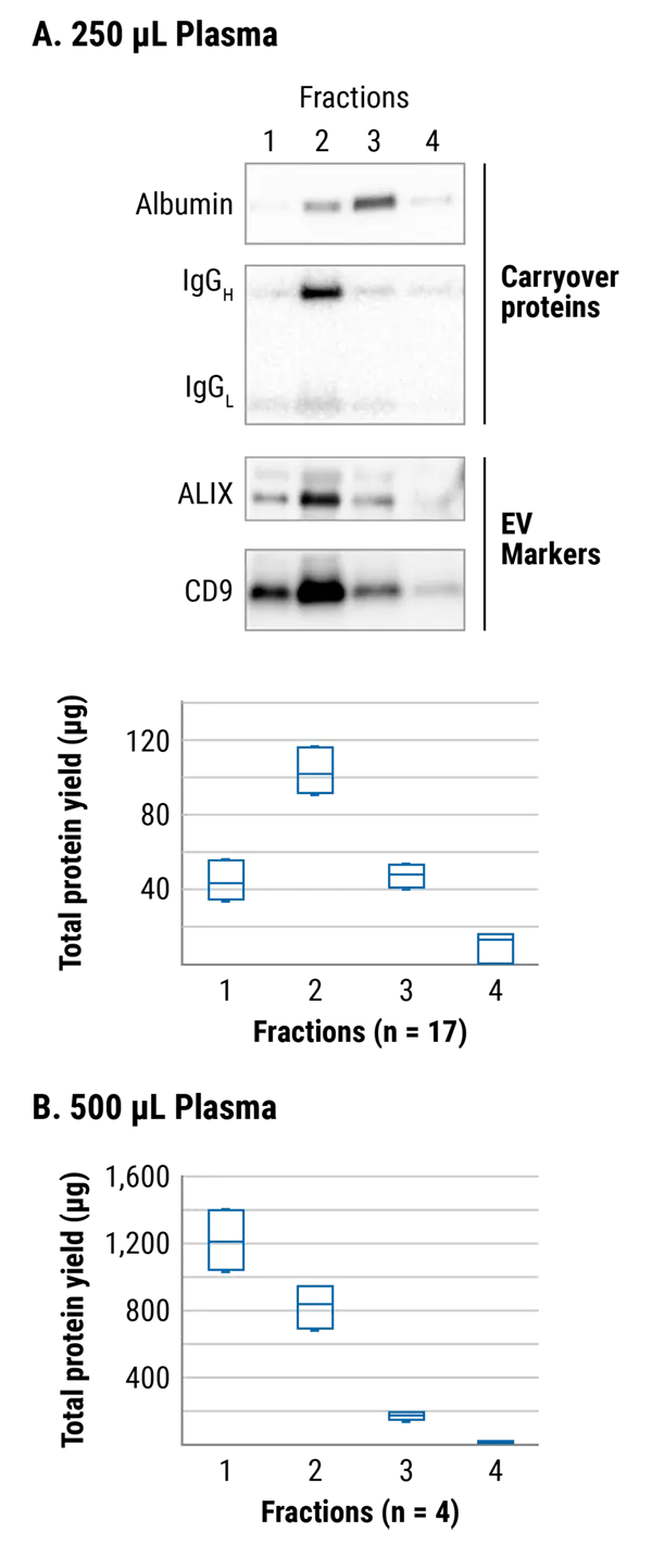 As is characteristic of size exclusion chromatography (SEC), EV elution profiles depend on both input sample volume and eluent volume. When 250 µL of plasma was processed (A), fraction 2 contained the highest EV concentration, whereas with 500 µL of plasma (B), fraction 1 contained the highest EV concentration. For initial use of SmartSEC™ HT, it is recommended to collect fractions 1 and 2 separately, analyze EV content, and determine whether pooling is appropriate based on experimental requirements.